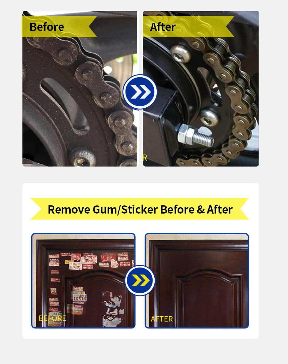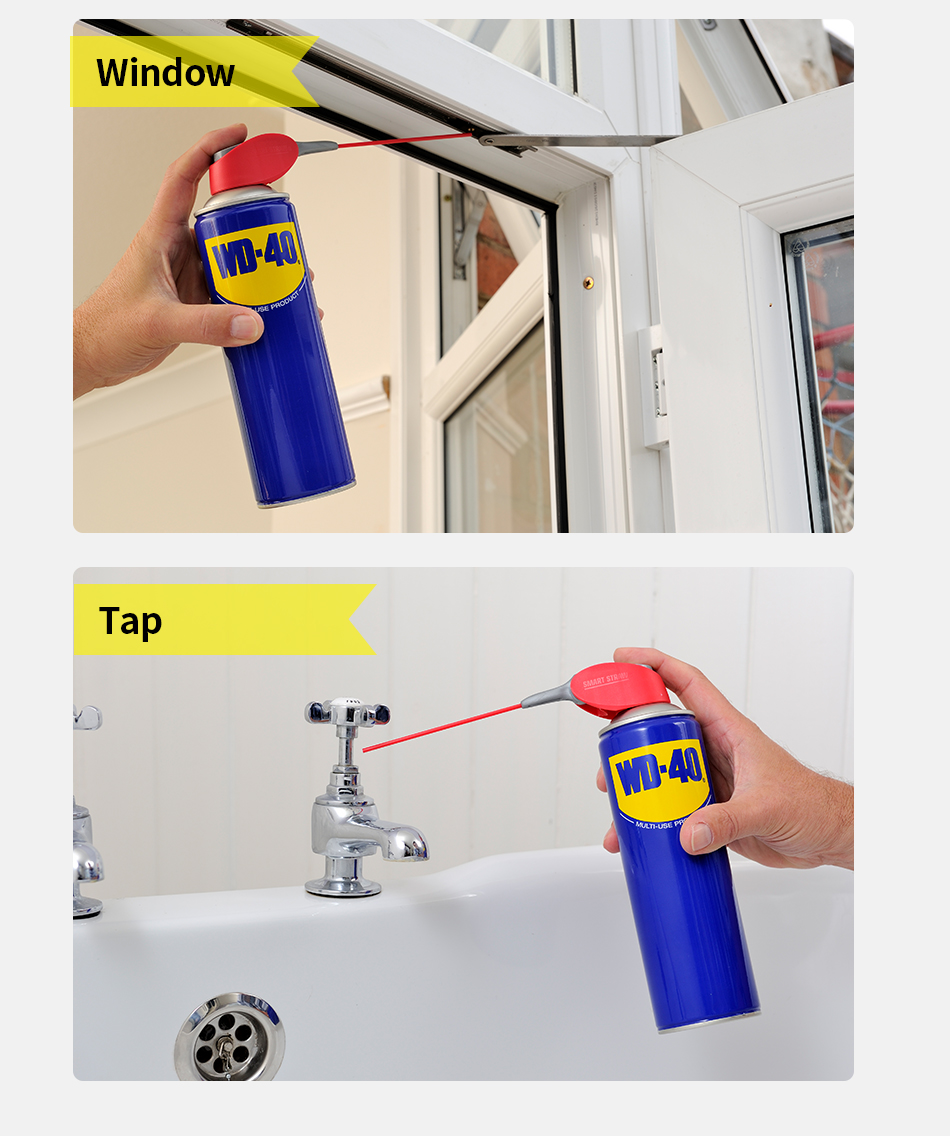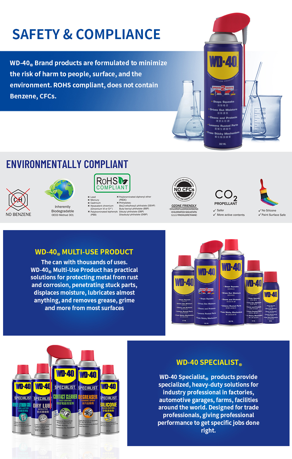 WD-40® Multi-Use Product lubricates moving parts such as hinges, wheels, rollers, chains and gears. It protects against rust and corrosion on items like tools and sporting equipment. It penetrates to free stuck corroded parts like nuts, bolts, valves and locks. It quickly removes adhesives, corrosion and paint. It displaces moisture to restore water flooded equipment such as engines, spark plugs and power tools.
